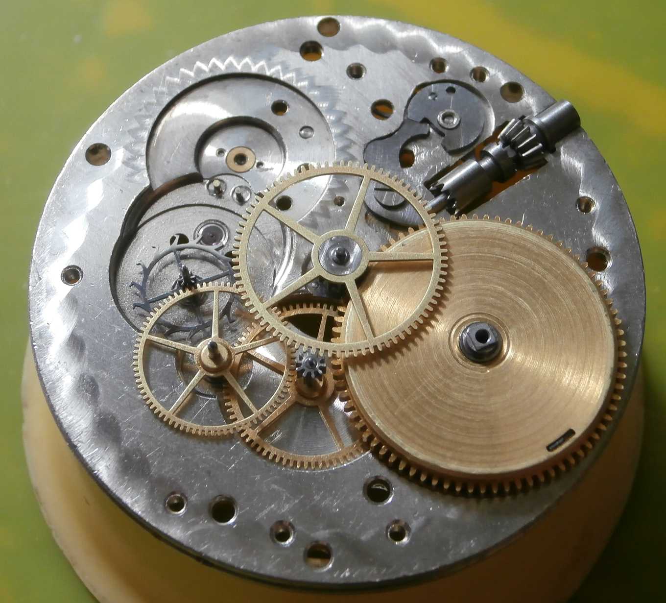LANGE Lange alapszerkezet, 1895 körüli gyártásból. Az összes Glashüttei jellegzetességgel, ¾-es híd, Lange-kilincs, szerelt Glashüttei billegő, külön átmenő tengellyel, vezetőkő a küllőben, Glashüttei horgony-gátszerkezet, aranyötvözet testű horgonnyal. Jó állapotú eredeti porcelán számlap, máltai-kereszt, kiváló kidolgozás.A werk és számlap eredendően nagy mérete okán viszonylag termetes beépítés, a mutató-állítás is átalakítva nyomógombosra. |